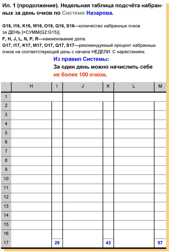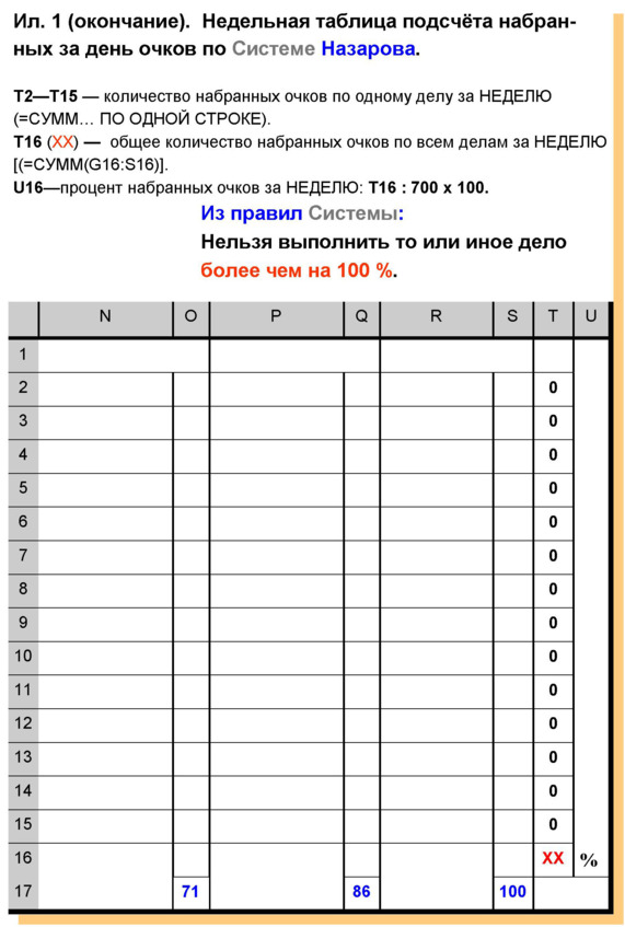 16. T2 – T15 – количество набранных очков за ОДНО дело, за всю НЕДЕЛЮ. Определяется путём сложения набранных очков за каждый ДЕНЬ недели. Построчно.