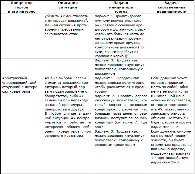 В табл. 2.1–2.4 мы подготовили краткий обзор наиболее часто встречающихся на практике соотношений интересов собственника недвижимости и других лиц, участвующих в продаже имущества на торгах.