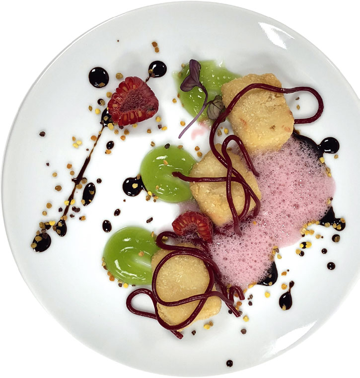 ПОДАЧАВсе компоненты уложить, как на фото. Декорировать свежей малиной, микрозеленью и цветочной пыльцой.