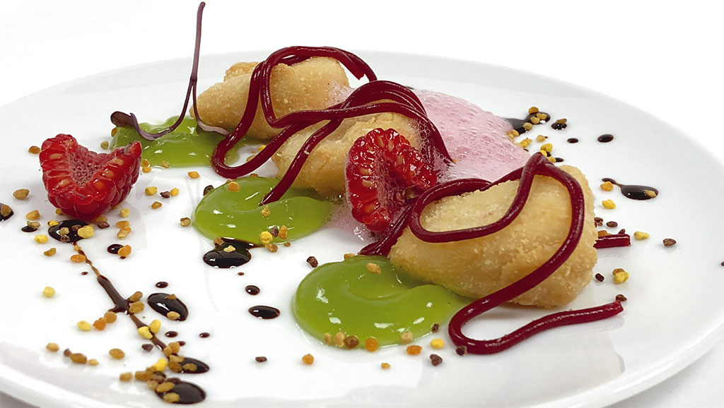 Камамбер в миндальной крошке под гранатовой пеной с тархуновым гелем и малиновыми спагетти