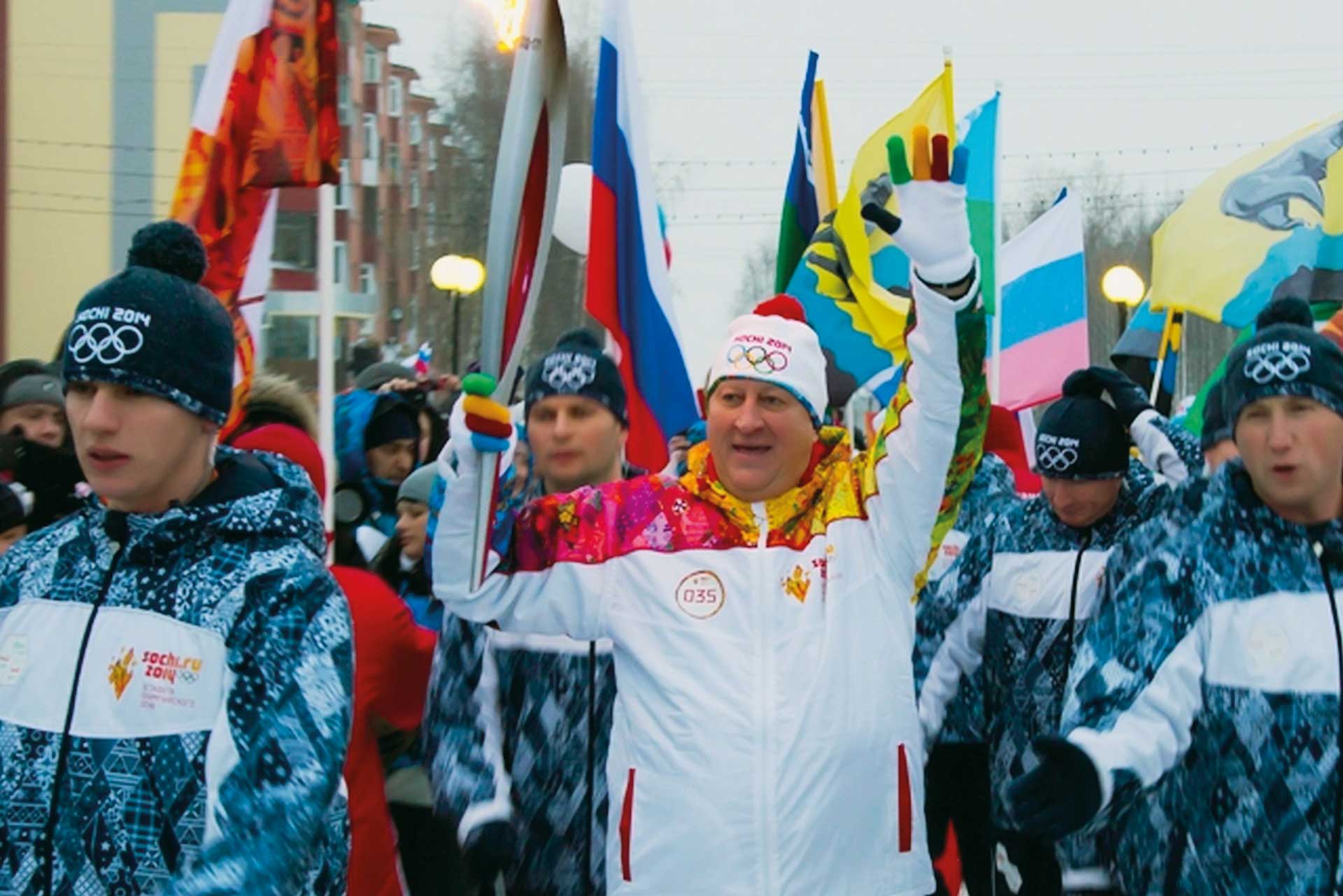 С олимпийским факелом – заслуженный тренер России, директор спортивной школы Алексей Казаков, Нефтеюганск, 2013 год