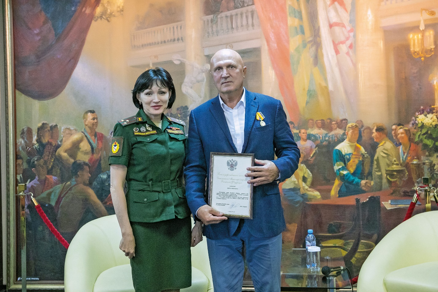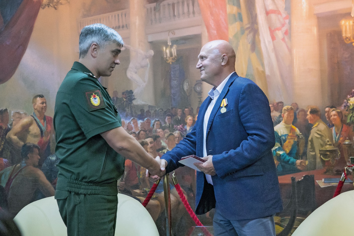 Олег Боцман вручает медаль «100 лет Центральному спортивному клубу Армии» Виктору Яковлеву, первому вице-президенту Федерации дзюдо Санкт-Петербурга