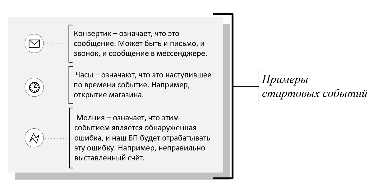 У нас всегда есть стартовое событие, запускающее процесс. Оно обозначается кружком с тонкой линией, в который может быть вписан значок, уточняющий характер этого события (Рис. 1. Примеры стартовых событий)