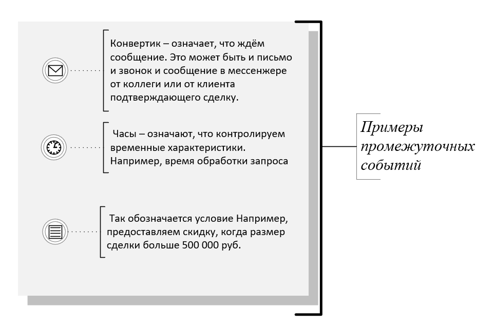 События могут возникать и посередине БП. В этом случае процесс будет течь дальше, только тогда, когда это событие произойдет. В нашей графике это будет нечасто. Вот несколько примеров таких событий (Рис. 2. Примеры промежуточных событий). Обратите внимание, что у промежуточных событий кружок с двойной границей.