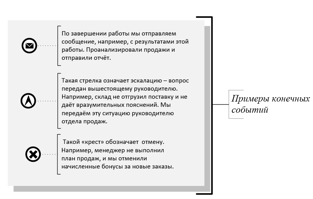 Любой БП – это движение к результату, другими словами, он завершается событием. При чтении графики это сильно облегчает восприятие. И в отношении конечных событий мы будем применять практически весь доступный арсенал. Так как они будут подробно закомментированы, а кроме того, в текстовой части БП вы всегда найдёте описание таких событий, приведу только несколько примеров (Рис. 3. Примеры конечных событий.)