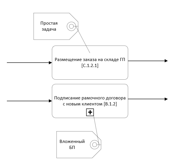 Отличить простую задачу от вложенного процесса легко – у вложенного БП есть крестик. (Рис. 5. Простая задача и вложенный БП.)