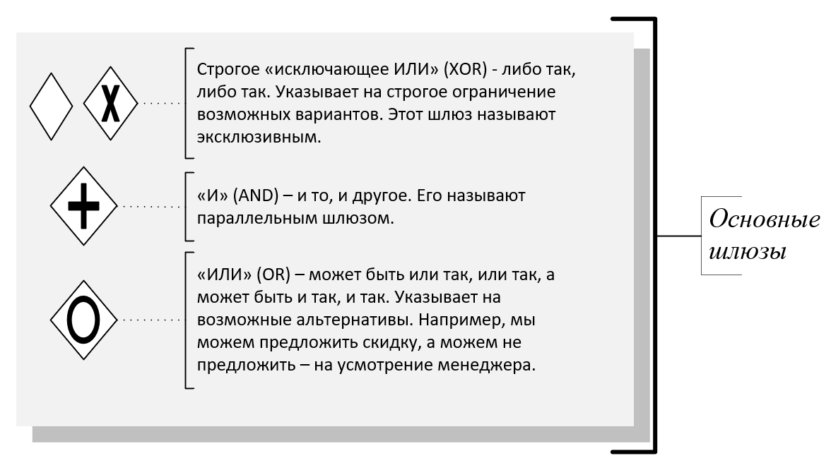 Шлюз – это один из самых важных элементов БП, так он показывает логику процесса работы. В полной версии BPMN порядка 6 видов шлюзов. Мы будем использовать только основные. Их я укажу ниже (Рис.6).