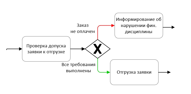 Например, нам нужно на графике отобразить такую ситуацию: Если «все требования выполнены» (товар оплачен, менеджер подтвердил отгрузку), то «совершить отгрузку» (нижняя часть графики). ИЛИ «Оплата товара не произведена» и «необходимо сообщить об этом менеджеру» (Рис. 7. Пример исключающего ИЛИ на выходе)