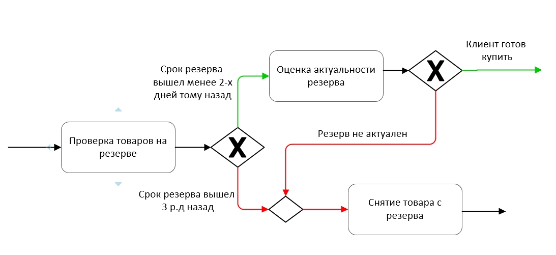 Этот же шлюз может быть расположен перед задачей, тогда он будет читаться по-другому (справедливости ради, в этой ситуации его можно заменить OR (ИЛИ), но это задаёт тонкости прочтения, пока их опустим). Например, у нас вот такая ситуация: Мы проводим проверку зарезервированных товаров под заказы. Среди них мы обнаруживаем те, у которых срок резервирования просрочен более, чем на 3 дня. Их мы должны снять с резерва. Кроме того есть заказы, по которым срок резерва вышел сегодня или вчера. В отношении этих заказов нужно связаться с клиентом. В результате этого, часть заказов нужно будет снять с резерва, а часть оставить. В графике это будет выглядеть так (см Рис. 8. Пример исключающего ИЛИ на входе).
