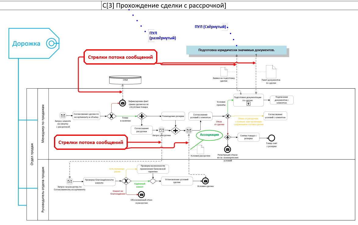 Юрист у нас как раз и будет представлен в форме свёрнутого Пула. Он “живёт” в БП “Подготовка юридически значимых документов”. Сам процесс выполняется в рамках отдела продаж (это дорожка, разбитая на ещё 2 дорожки). Одна принадлежит исполнителю (менеджер по продажам), а другая руководителю отдела – он у нас оценивает клиента и разрешает сделку.