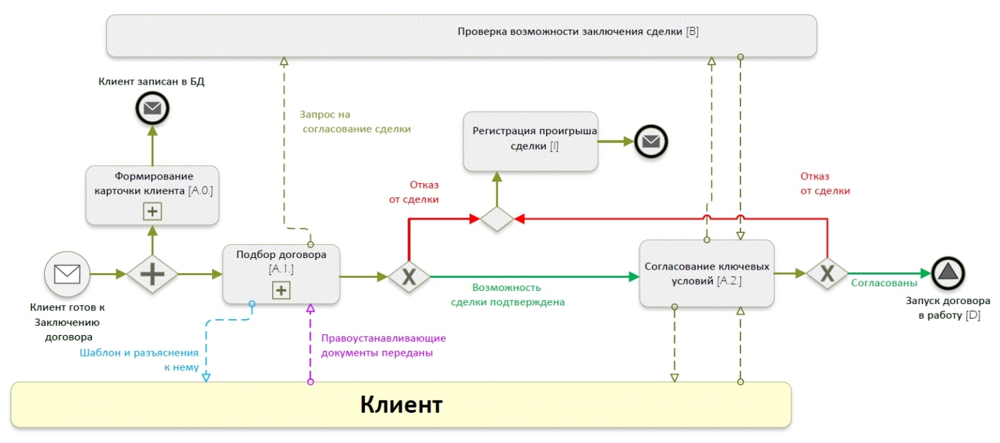 Комментарий: В рамках этого подпроцесса реализуется взаимодействие между клиентом, менеджером и юридическим отделом.
