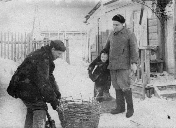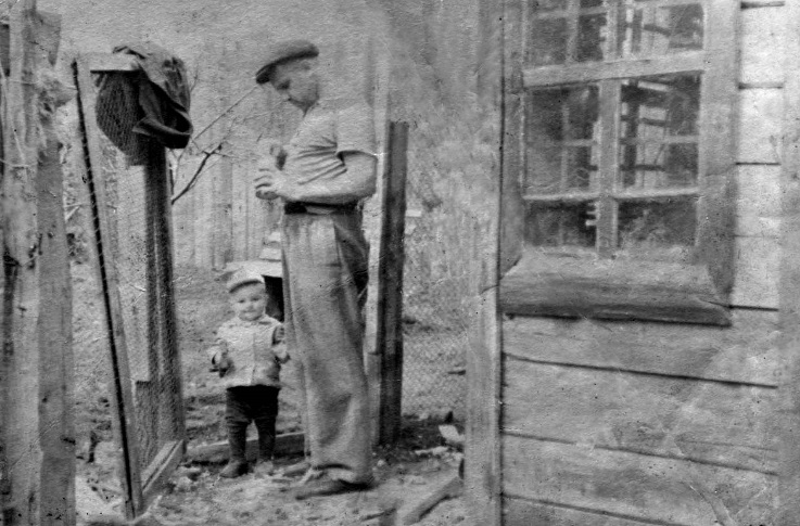Николай Солопанов с сыном Володей около времянки. Воронеж, начало 50-х годов ХХ в.