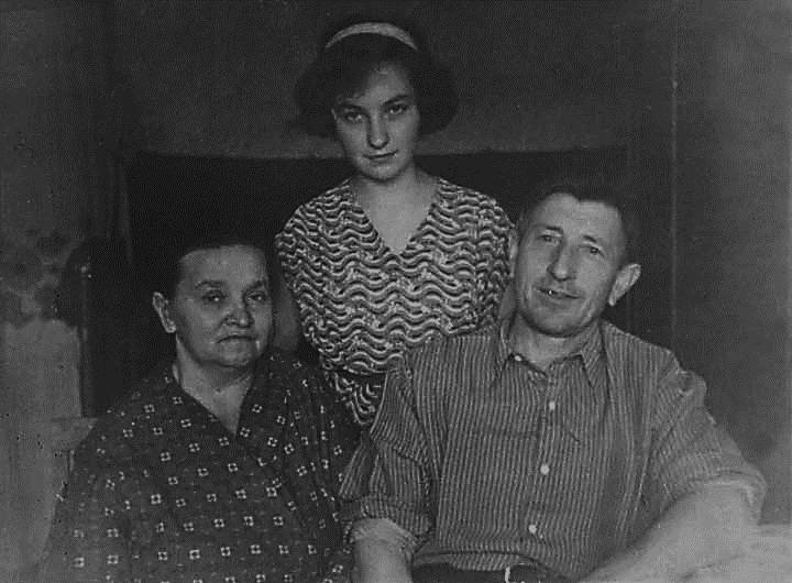 Екатерина и Тихон Базилевские с дочерью Еленой в квартире по ул. Ф. Энгельса, дом 37. Фото начала 60-х гг. ХХ в.
