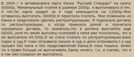 Реструктуризация – это, по сути, выдача нового кредита на новых условиях. Давайте прикинем на примере. Предположим, что у человека долг в 200 тысяч, 60 тысяч просроченных процентов и еще тысяч 20 неустойки. Банк складывает эти цифры и оформляет на эту сумму новый кредит, который идет в погашение текущей задолженности. Таким образом, вместо решения своей кредитной проблемы человек получает обязательства по выплате нового кредита уже в размере 280 тысяч, под увеличенную процентную ставку и увеличенный размер неустойки. Не забудьте, что при оформлении кредита еще могут и страховку навязать, от риска невозврата кредита, например. То есть одной подписью заемщик увеличил свой долг, не получив никаких преимуществ. Да, иногда банки уменьшают размер ежемесячного платежа, растягивая долг на больший срок. Но, чем больше срок, тем больший размер процентов нужно будет заплатить. И есть ли в этом смысл, если денег как не было, так и нет? В целом, все кредитные истории о реструктуризации выглядят примерно одинаково.