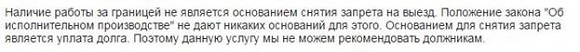Следом обратился еще один представитель. Уже другая компания и другой сайт, но смысл тот же. Меня заинтересовала услуга «DebtTravel», которая дает право должнику снять запрет на выезд за границу. Суть услуги заключается в том, что заемщика как-бы устраивают на работу за рубежом, а потом предоставляют справку, что ему нужно выехать на обучение за границу. Он несет эту справку приставу, а «судебный пристав не имеет права отказать в ходатайстве о снятии ограничения на выезд за пределы РФ». Это цитата с их сайта. Хотел бы я посмотреть на пристава, которому принесли такую справку. Бред же. Я написал этому представителю: