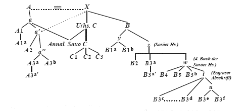 После работ А. Отто[39] и С. Булина[40], находки Й. Данструпом новой рукописи из группы B[41], а также особенно важных находок и исследований А. Кристенсен[42] стало понятно, что предложенная Б. Шмайдлером стемма не вполне удовлетворительна. Как считает А. Кристенсен, правильно подразделив рукописи на группы, издатель не вполне правильно выстроил отношения между этими группами и внутри них. Исследовательница доказывает, что редакция А была сокращенным вариантом редакции X, однако, несмотря на это, в имеющихся рукописях группы А содержатся чтения, более близкие к протографу, чем в имеющихся рукописях групп BC. Здесь следует оговориться, что в вопросе рукописной традиции я пользуюсь выводами Б. Шмайдлера, так как последующие историки, поставив под сомнение предложенную им стемму, сами не смогли создать новую, и притом непротиворечивую. Кроме того, внесенные ими коррективы не подрывают оснований, на которых зиждется критическое издание Б. Шмайдлера.