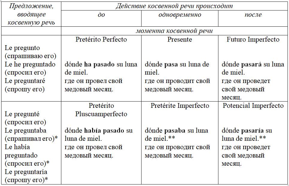 Примечание: *В таком вопросе в косвенной речи, как и в прямой, подлежащее всегда следует за сказуемым, но не обязательно сразу после него: Me preguntan de dónde son ellos/cuándo llega el próximo tren/dónde encontró este coche la policía. Меня спрашивают, откуда они (родом)/когда пребывает ближайший поезд/где нашла эту машину полиция.