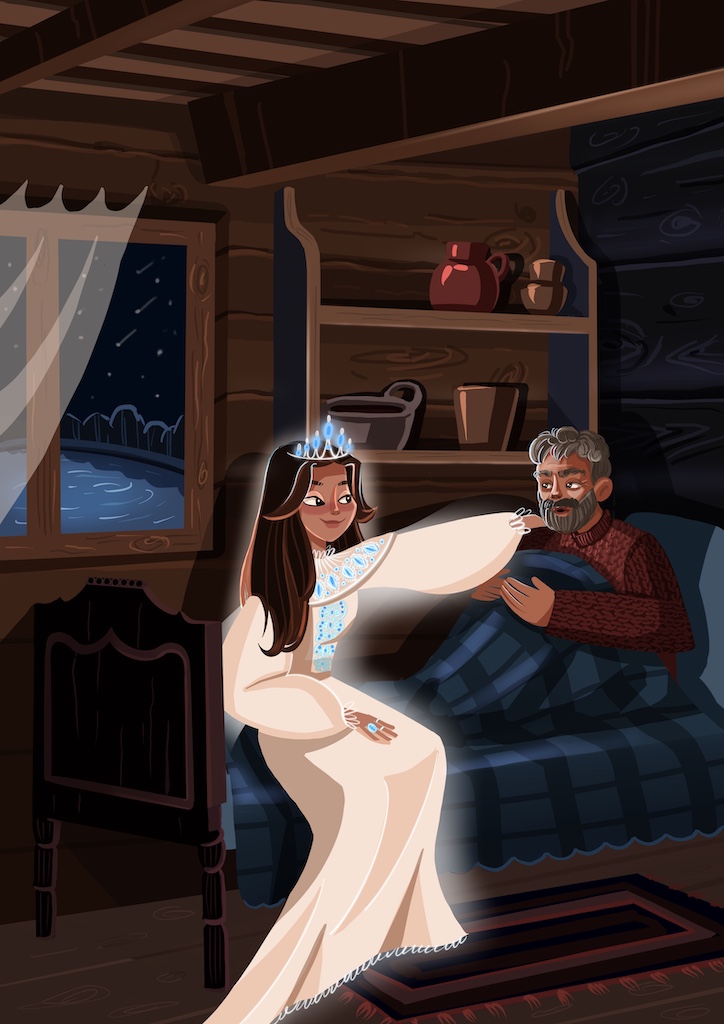Лаврентию Евгеньевичу показалось, что он очнулся почти мгновенно. Оглядевшись, он увидел комнату в избе, а рядом с ним сидевшую Зинаиду Павловну в белоснежном платье, украшенном белыми сверкающими камнями. На голове у нее была диадема с голубыми самоцветами и огромным ярко‑голубым камнем в центре. «Бриллианты!» – подумал Лаврентий Евгеньевич. Он хотел было привстать, как Зинаида Павловна помешала ему, нежно положив руку ему на плечо.