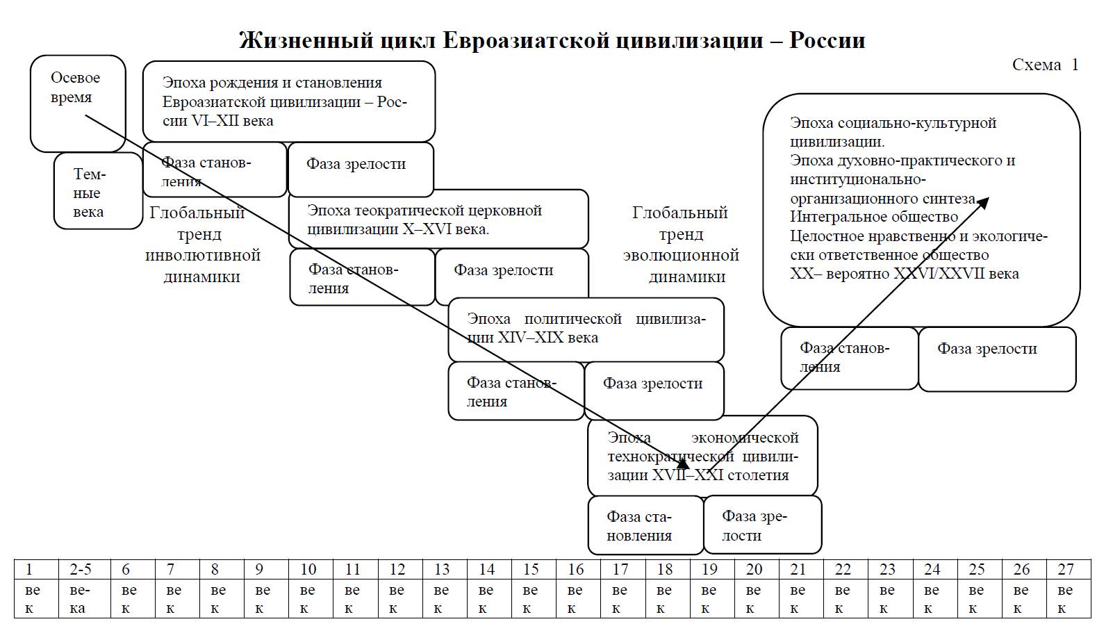 При этом мы видим, что в библейском повествовании эти фазы суточного цикла следуют одна за другой не в очевидном для нас порядке: утро-вечер, а в обратном порядке: «и был вечер, и было утро». Можно предположить, что таким образом в символической форме передается наличие фазочастотного сдвига между фазами каждого дня творения: утро следующего дня зарождается наряду с вечером дня предшествующего. Новый день зарождается в рамках дня предшествующего. Происходит трансформация, перетекание жизненной энергии из старых форм предшествующего дня, в новые формы нового дня. Таким образом, обозначается наличие фазочастотного сдвига между днями (эпохами) процесса сотворения, становления и развития мира. Качественно новое устройство общества прокладывает себе путь преодолевая сопротивление прежнего устройства, отжившего свой век, и теряющего действенность и эффективность. С учетом принципа когерентности структура жизненного цикла Евроазиатской цивилизации имеет следующий вид (см. Схему 1).