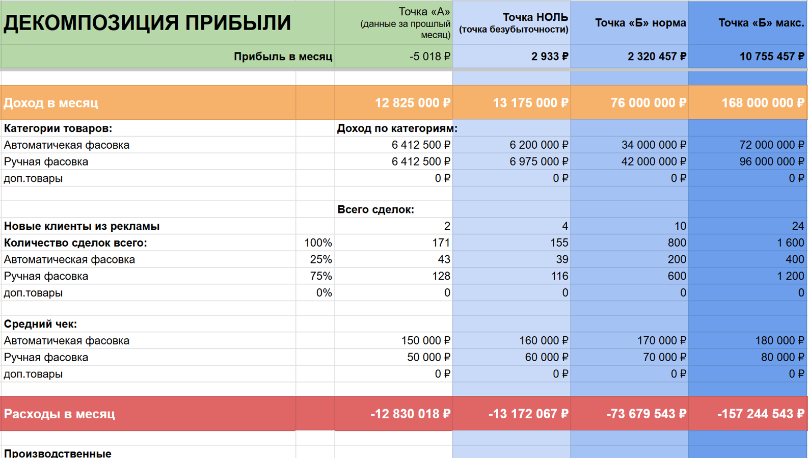 Суть файла декомпозиции – составить ясное понимание, из чего складывается доход и расход «сейчас», а также для точки «Б норма» и «Б макс». Ключевыми параметрами дохода являются: количество сделок по категориям, средний чек и общая выручка по категориям.