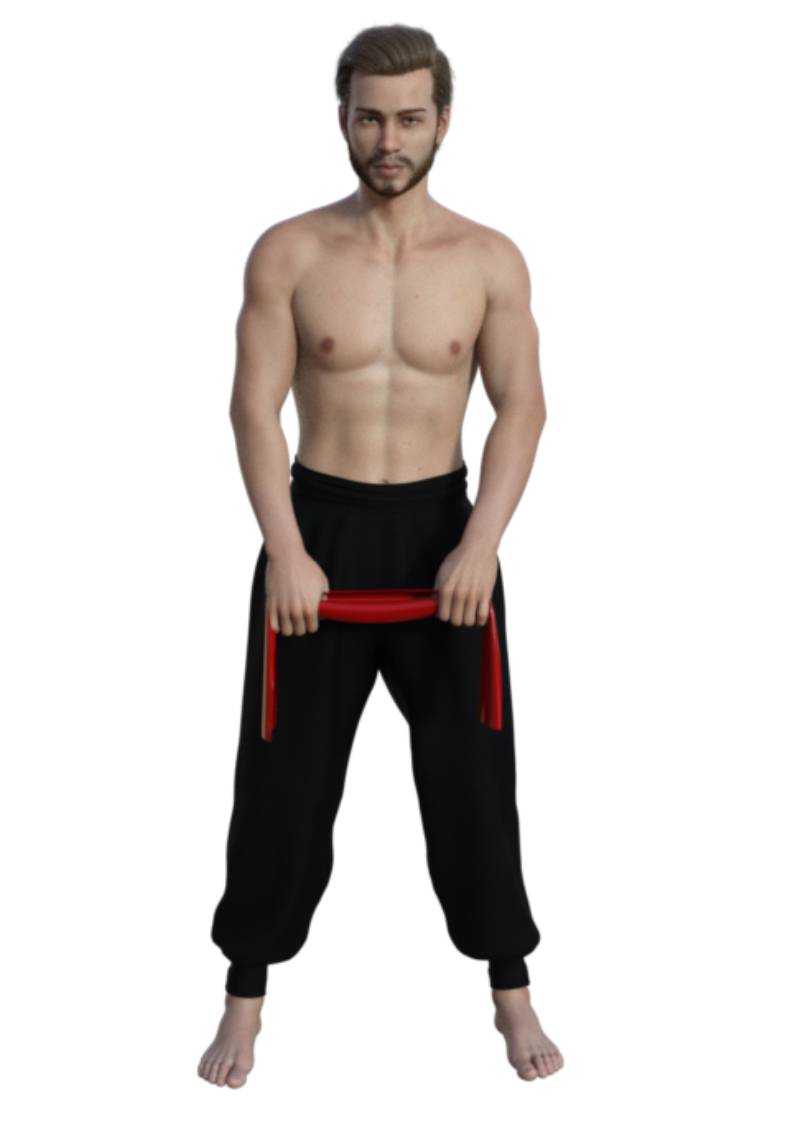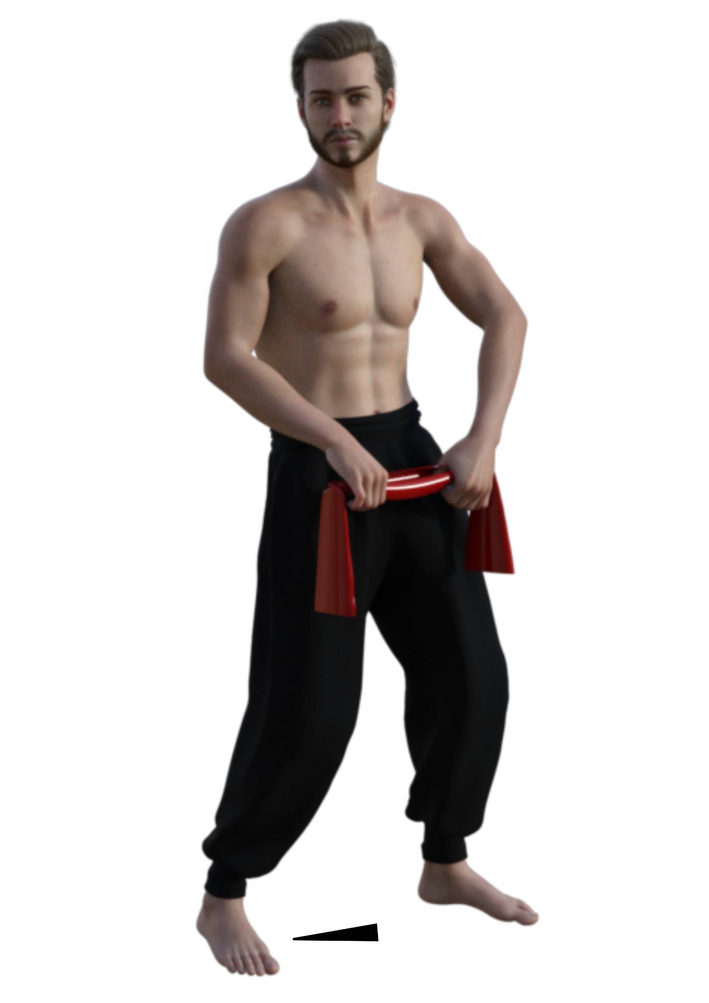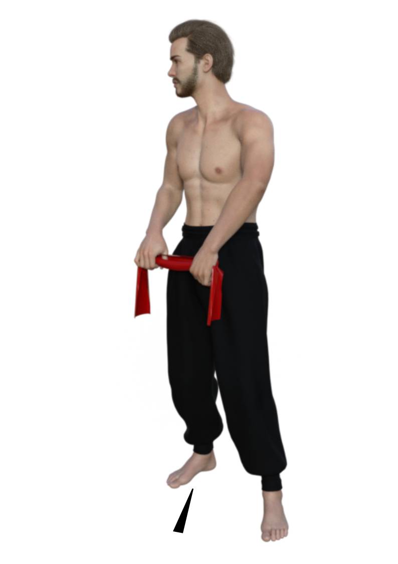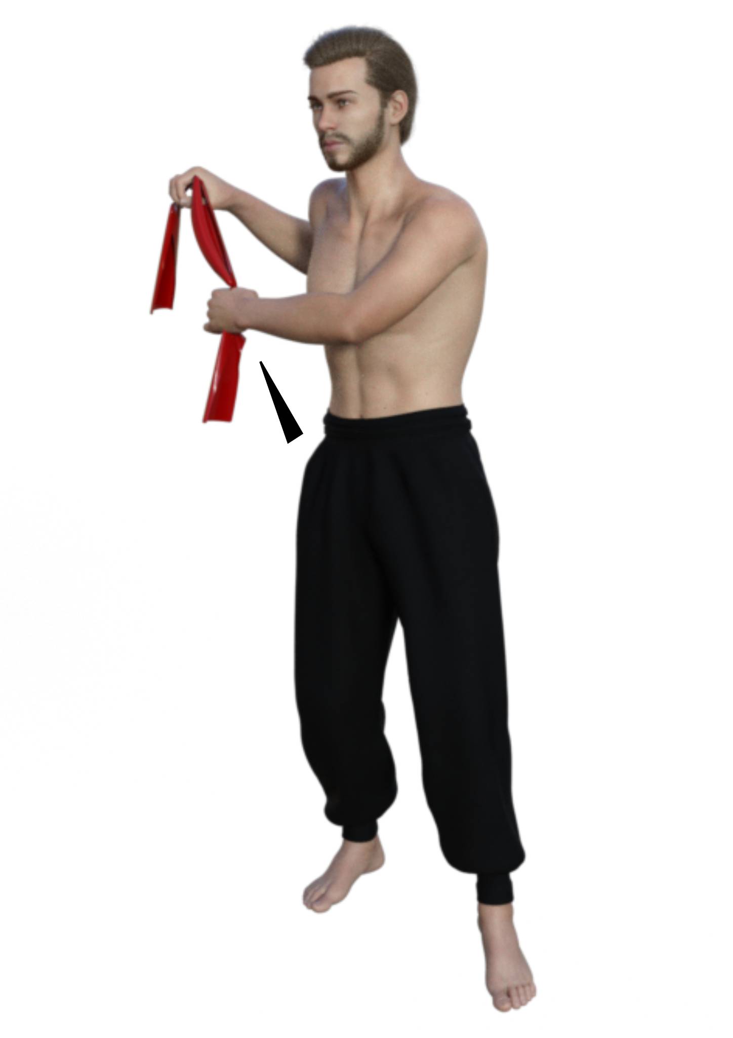 Первым движением сделайте шаг назад правой ногой, и поверните голову вправо почти до предела. Все тело тоже поворачивается вправо. Руки немного поднимают полотенце и с силой его растягивают.