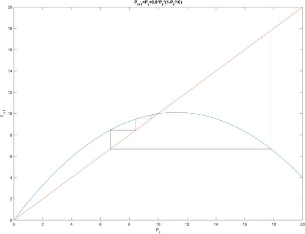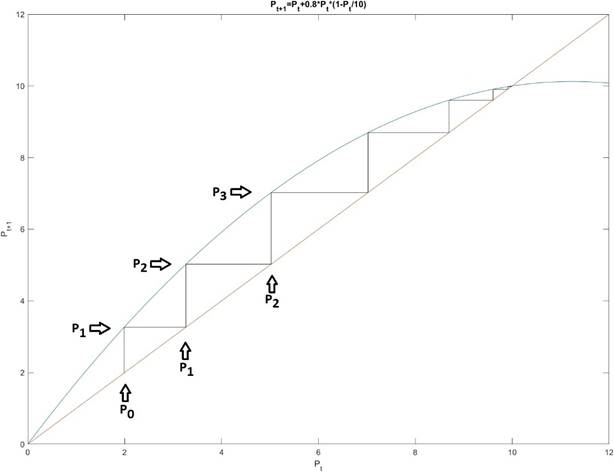 Первый из таких методов называется «Паутина». Паутина является основным графическим методом для понимания математической модели дискретного логистического уравнения. Это лучше всего проиллюстрировать на примере.