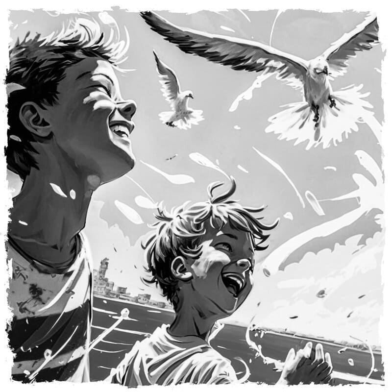 Быстро набросав карандашом на вырванном из ученической тетрадки листе картину, он передал её морскому ветру, который вызвался доставить эскиз до адресата. Ветер приступил к делу осторожно, со стеклянным трепетом и почтительным молчанием. Листочек взмыл вверх, расслабился и, расставив края в разные стороны, понёсся, подгоняемый потоками тёплого бриза. По пути, чуть свёртываясь в трубочку, затем распрямляясь, он изображал в воздухе различные фигуры, показывая, на что способен простой прямоугольный лист бумаги, если его не сдерживать скрепами и обложками. Через некоторое время, почти не устав, он достиг цели своего путешествия, медленно приземлившись на деревянную палубу прямо перед ногами Человека.