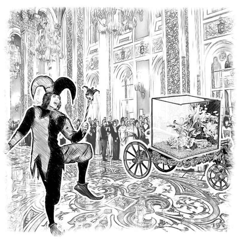 Из абсолютной темноты в проёме появилась изящная четырёхколёсная повозка, усыпанная бриллиантами и сапфирами. На ней возвышался большущий, в человеческий рост, аквариум, стёкла которого были практически невидимыми для глаз, словно их сделали из чистейшего хрусталя.