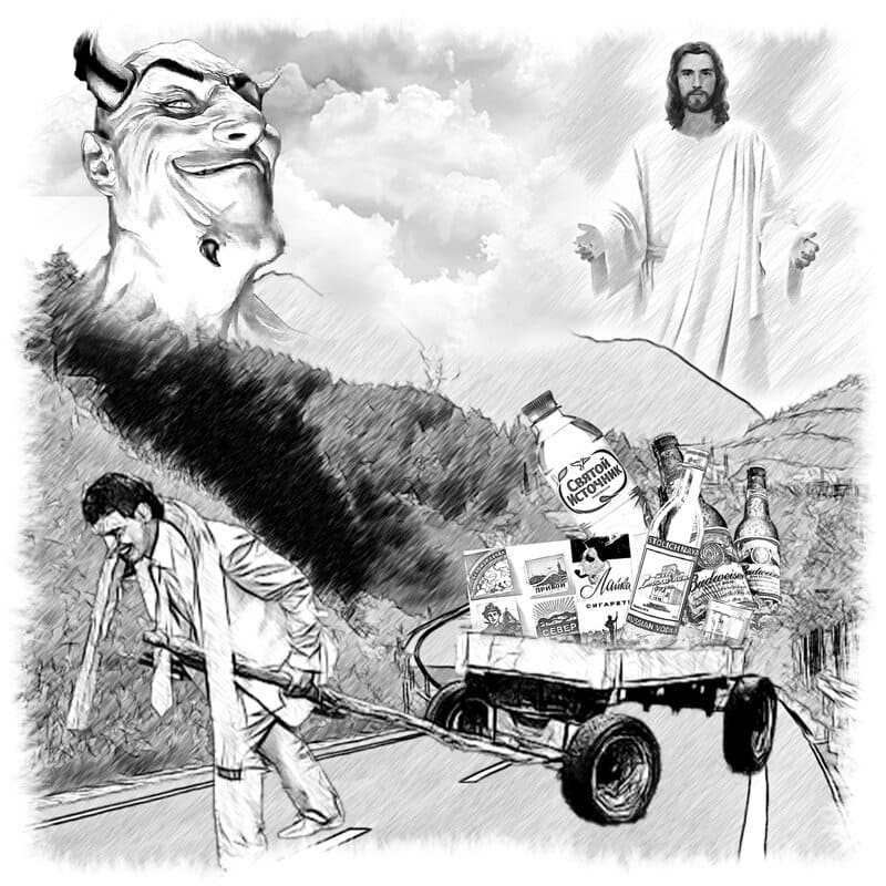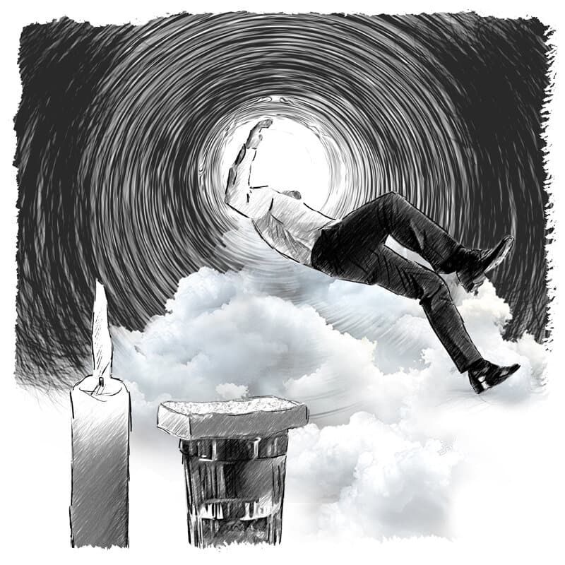 Сначала через трубу, разившую ржавым железом и ещё каким-то неприятным запахом, от которого воротило с души. Потом – через бетонный тоннель, пахнущий сыростью и спиртом. Впереди появился свет. Такой яркий, зазывающий, наполненный магнетической силой, от которого невозможно было съюлить, прикрыться, обмануть самого себя. Где-то позади послышался плач, переходящий в истерику. Обернувшись, путешественник увидел ничем не запачканную белую скатерть на столе. Она была странно чиста, следы от содержимого сумки исчезли. На столе стояли свечка, его фотография и стопочка водки, прикрытая куском хлеба.