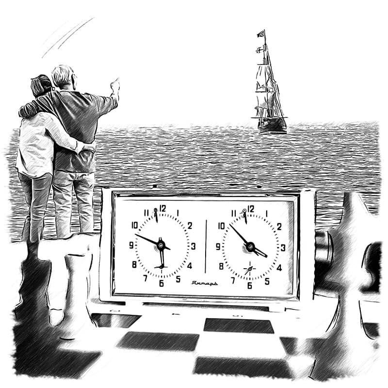 «Поскорее, поскорее, осталось немного». Вскинутые вверх руки танцующих цепляются за невидимые верёвочные лестницы. Шаг за шагом мы поднимаемся всё выше и выше и ступаем на борт белоснежного лайнера, который вот-вот должен отплыть от причала детства. Капитан дает команду – «Отдать швартовы!» Корабль трогается, за бортом плещутся волны. На берегу стоят папа и мама. Они машут мне руками, украдкой вытирая слезинки с глаз. Всё, один из флажков на шахматных часах упал, одиноко свесив голову вниз. Это произошло на часах, отсчитывающих время папы. Я слышу свой голос: