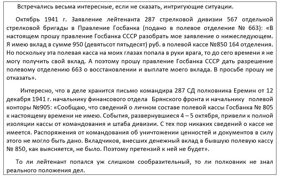 Здесь не могу не отметить, что крайнюю степень истощения, всех вышедших из окружения, в т. ч. и сотрудников полевых учреждений. Это особо подчеркнул в своем донесении ст. инспектор полевой конторы Госбанка № 1606 В.М. Щелкунов, командированный 28 июня 1942 г. во 2 У.А. для выяснения обстоятельств гибели ПОГ №930 и подчиненных ему подразделений и поиска свидетельств, подтверждающих факт уничтожения вверенных им ценностей и документов.