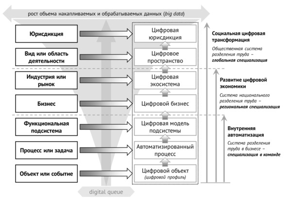 Вспомогательный терминоэлемент «цифровая» показывает, что истоком нового этапа автоматизации высокого уровня явились информационные технологии, а доминантное слово «трансформация» означает переход к существенно иной модели массового непрерывного обслуживания потрбителей с кардинальным сокращением издержек и снижением конечной цены. В этом случае бизнес полностью перестраивает свою работу. Причем так, чтобы поддержать целостную и формализованную модель удовлетворения своих потребностей, потребностей своих клиентов и контрагентов в эффективном автоматизированном или автоматическом режиме.