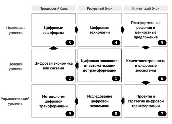 Совокупность знаний теории управления цифровой трансформацией целесообразно разделить на три тематических блока: процессный, ресурсный и клиентский.