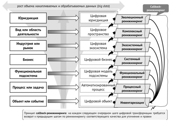 Цифровая трансформация сводится не только к внедрению информационных технологий нового уровня, но и в большей степени к осуществлению высокого уровня периодически повторяемого реинжиниринга сквозных процессов, имеющих ценность для конечных клиентов и прямой выход на них.