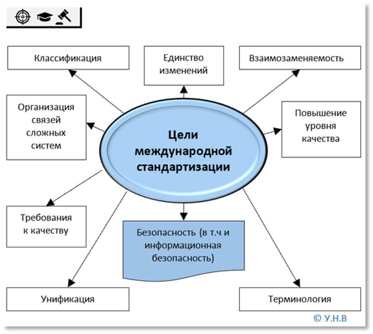 Процесс международной стандартизации имеет прямое отношение к безопасности и международным торговым отношением. Цели международной стандартизации, представленные на рисунке 1.19 подтверждают это. К одной из главных целей относится повышение уровня качества продукции в развивающихся странах до уровня качества высокоразвитых стран. Другими не менее важными целями, являются требования к качеству, унификация и единство изменений. Возможно, повышение качества можно поставить в один ряд с безопасностью, так как в современном урбанизированном мире от качества зависит безопасность.