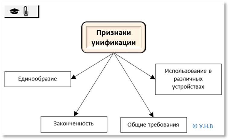 Единообразие в конструктивном оформлении изделий является основным признаком. Кроме этого, изделие должно обладать функциональной законченностью. Другим признаком унификации является подчинение основных параметров изделий общим требованиям или подчинение основных параметров ряда изделий определённому закону. Есть ещё один признак, характеризующий возможность использования унифицированного изделия в составе различных устройств, различного функционального назначения. Основываясь на данных признаках, можно сказать, что унификация – деятельность по рациональному сокращению числа типов деталей, агрегатов одинакового функционального назначения. Унификация базируется на классификации, селекции и симплификации, типизации и оптимизации элементов готовой продукции.