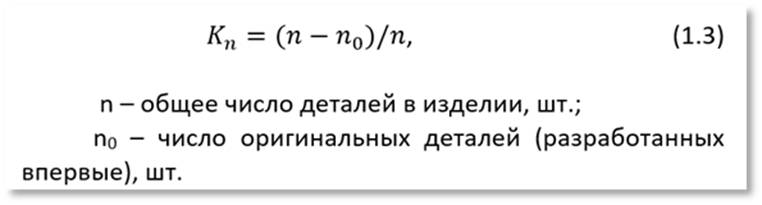 Основные положения» (Стандарт СССР) установлены основные этапы проведения работ по унификации. Под уровнем унификации изделий понимается насыщенность их унифицированными составными элементами: деталями, узлами, агрегатами, модулями. Уровень унификации определяется рядом показателей, таких как: коэффициент применяемости, коэффициент повторяемости, коэффициент межвидовой унификации, коэффициент унификации группы изделий. Основным – является коэффициент применяемости, который вычисляют по формуле: