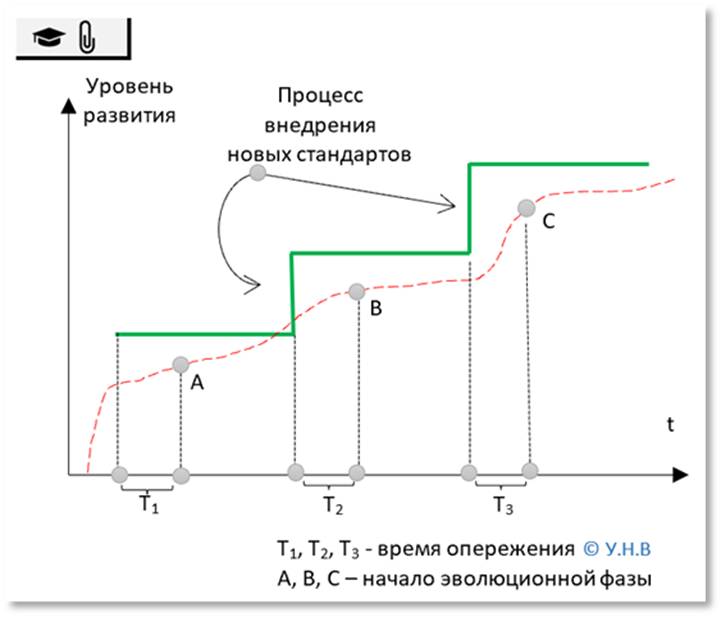 На рисунке 1.39 представлен графический пример опережающей стандартизации. Процесс внедрения новых стандартов проходит с опережением уровня развития.