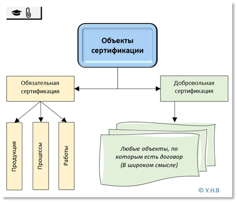 Объекты сертификации имеют множественные различия, объединяющим фактором является характер сертификации, разделённый на два класса: