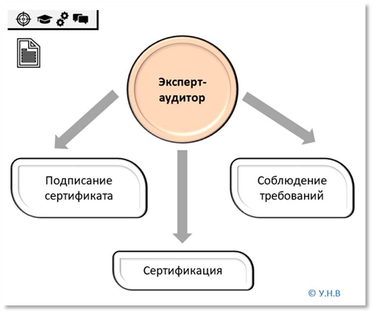 Для проведения работ по обязательной сертификации орган по сертификации привлекает экспертов-аудиторов. На рисунке 1.45 представлены задачи, выполняемые экспертами-аудиторами, участвующими в обязательной сертификации. Такие эксперты выполняют работы по обязательной сертификации, соблюдают требования законодательства о техническом регулировании и подписывают сертификат соответствия. Эксперты-аудиторы должны не только быть специалистами в области сертификации, но и уметь осуществлять проверочные действия.