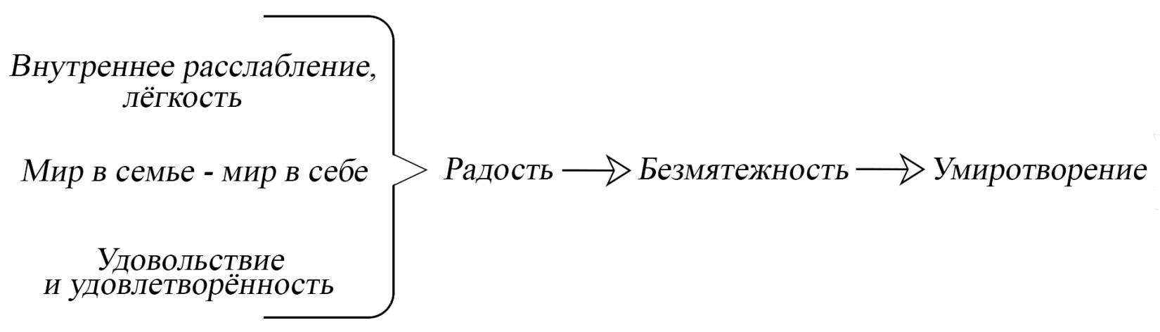 «Строительными элементами» модели являются: внутреннее расслабление, легкость; атмосфера эмоциональной теплоты и внутреннего мира; удовольствие и удовлетворенность от приятных процессов, хобби, труда или творческой деятельности. Систематическое удовлетворение данных акцентов запускает накопительный процесс – от радости до состояния умиротворения. Единственным условием является коррекция восприятия, о которой мы поговорим в одной из дальнейших глав.