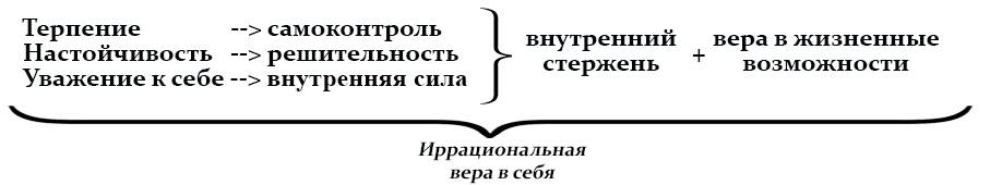 В совокупности и при развитии система указанных акцентов формирует внутренний стержень, сочетание которого с верой в жизненные возможности даёт «на выходе» состояние иррациональной веры в себя.