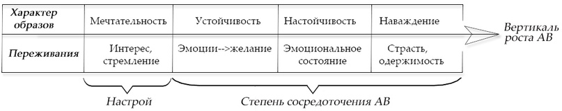 АВ – это направленность и сосредоточение бессознательного. Направленность АВ – это Ваш внутренний настрой. Например, стремление будущего художника к рисованию, интерес будущего скульптура к ваянию, Ваши интересы. Реализация направленности, то есть работа в этом направлении уже вызывает сосредоточение психики, вследствие чего стремление переходит в эмоционально выраженное желание, его многократное удовлетворение порождает эмоциональное состояние, которое, при условии дальнейшей концентрации трансформируется в наваждение. Таким образом, одно из проявлений АВ на практике – это образы, отражающие Ваш настрой, а в дальнейшем – предмет бессознательной концентрации. Потенциал и интенсивность этих образов соответствуют уровню сосредоточения – мечтательность (интерес, стремление), устойчивость (желания, эмоции – эйфория, возмущение, обида, боль…), настойчивость (эмоциональные состояния – умиротворение в хобби, любовь, приятные состояния измененного сознания и т. д.), наваждение (страсть, одержимость). Данная модель развития представляет собой вертикаль роста АВ на практике.