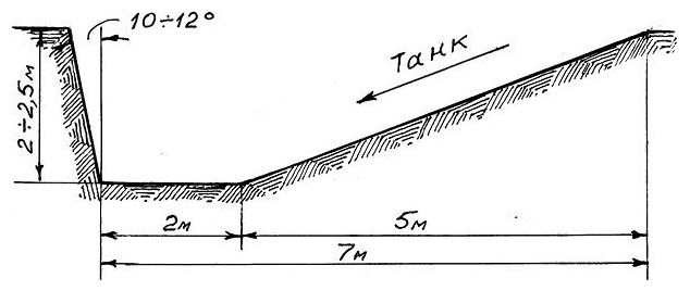 …Нашим первым рабочим местом стал участок левого берега Десны (против её течения). Этот берег был хотя и достаточно высок, но не так сильно крут, чтобы вражеский танк после переправы мог упереться в него лобовой частью. Поэтому здесь следовало создать большую крутизну берега на участке длиной примерно в 300 метров. Дальше между рекой и полем простиралась широкая (местами шириной не менее 500 метров) пойма. Она имела длину не менее 3 км. Здесь нам предстояло вырыть глубокий и широкий противотанковый ров, а также ров между деревней и Десной. Насколько я помню, ширина противотанкового рва (рис. 1) составляла 7 метров и более, глубина – от 2 до 2,5 метра, а иногда и меньше, если появлялась грунтовая вода. Движению танка должна была воспрепятствовать почти вертикальная (с уклоном в 10–12 градусов) лобовая стенка рва высотой от 2 до 2,5 метра, а сам танк должен был остановиться на горизонтальном «днище» шириной не менее 2 метров. К этому месту танк вела широкая (длиной около 5 метров) часть рва, имевшая значительный наклон.