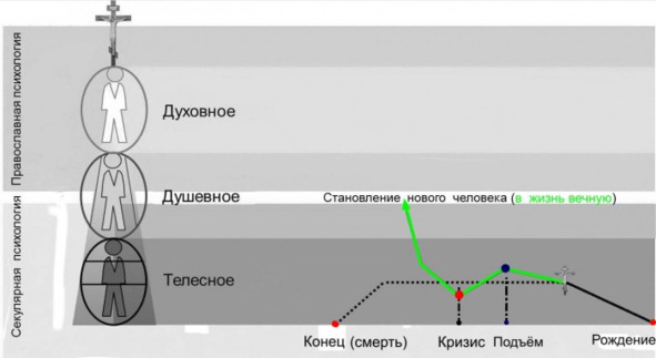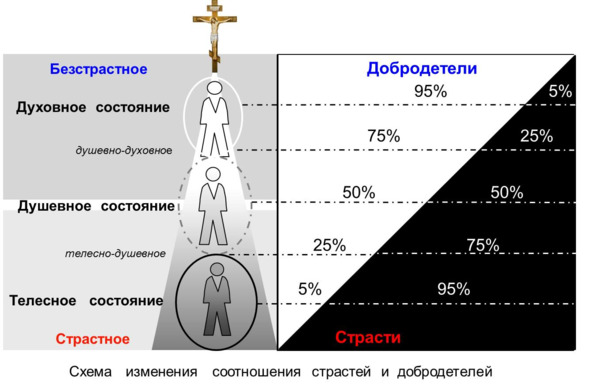 Св. Феофан Затворник, Что есть духовная жизнь и как на неё настроиться, 12, С. 43) «Видите, сколько у нас сторон или, лучше, степеней жизни! Есть сторона и степень жизни духовная, есть духовно-душевная, есть собственно душевная, есть душевно-телесная (кажется, я не оттенил ее как следует – сюда принадлежат наблюдения с воображением и памятью, желания из потребностей тела и чувства телесных состояний и впечатлений), есть телесная. Пять ярусов, но лицо человека одно, и это одно лицо живет то тою, то другою, то третьею жизнью и, судя по тому, какою жизнью живет, получает особый характер, отражающийся и в его воззрениях, и в его правилах, и в его чувствах, то есть оно бывает или духовным – с духовными воззрениями, правилами и чувствами, или душевным – с душевными понятиями, правилами и чувствами, или плотским – с плотскими мыслями, делами и чувствами.»