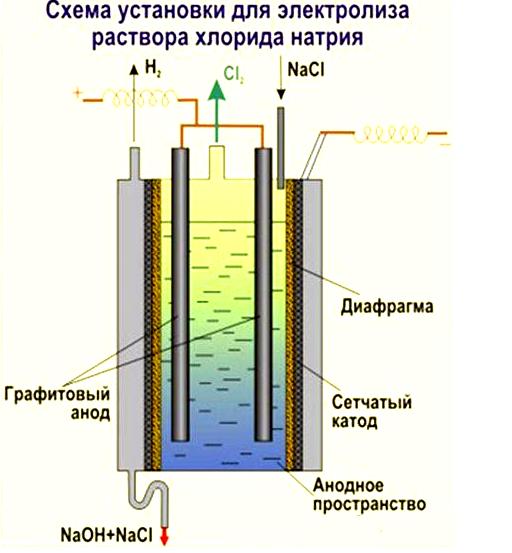 Как самый простой, применили диафрагменный метод получения хлора. Анод из графита, а катод это стальная сетка с асбестовой диафрагмой. Раствор хлорита натрия, а проще поваренной соли подаётся от анода к катоду. Такой метод называется противоток. Он позволяет отделить водород от хлора. После электролиза и отделения газов, получается концентрированный раствор. Поваренная соль выпадает в осадок, а раствор сульфата натрия сливается в отдельные ёмкости. При необходимости упаривается до твёрдого состояния.