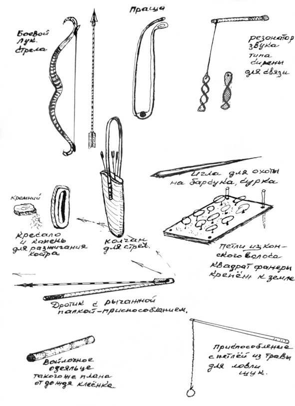 По образцу и технологии Бая мы сделали себе луки и стрелы под свой рост и силу руки. Стрелы нужного размера нарезали из тальника. Свежесрезанные прутья одним концом привязывались к балке под крышей сарая, а к другому концу привязывали тяжелый груз, за счет чего они вытягивались, выравнивались и сушились. Далее заготовки обрабатывались: снималась кожура, шлифовались. Потом уже их обматывали по всей длине мокрой бельевой веревкой, либо мокрым скрученным бинтом и равномерно слегка поджаривали на костре. Веревка снималась, каждая заготовка смазывалась барсучьим жиром и вновь подвешивалась с грузом под балку. Это называлось каленая стрела, легкая, ровная, прочная. Далее из перьев делалось крестообразное оперение, и крепился металлический трехгранный наконечник, отливали его в форме из глины прямо на земле, потом обрабатывали до нужной кондиции.