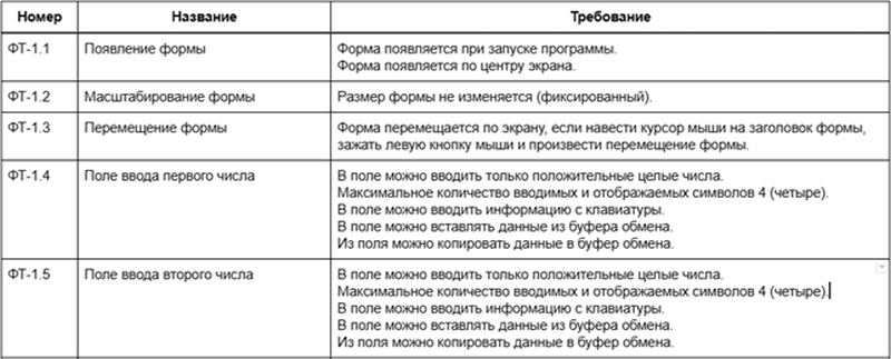 Функциональные требования – описывают функциональность, предоставляемую программным обеспечением. Они определяют, что должна делать программа. Сюда входят: возможность ввода и редактирования данных в поле программы; возможность очистки полей для ввода данных; возможность сложения чисел и т. д. На рисунке выше как раз отражена спецификация с функциональными требованиями.