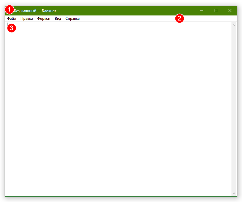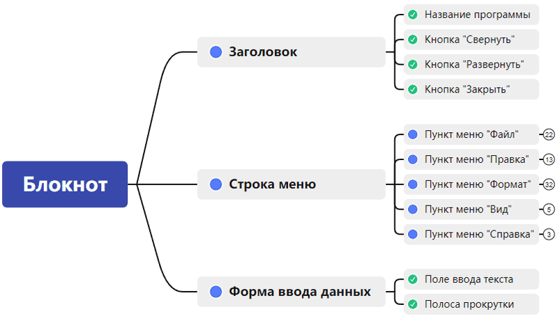 У программы «Блокнот» есть «Заголовок» (1), «Строка меню» (2), «Форма ввода данных» (3). Названные блоки (элементы) в свою очередь делятся на дополнительные элементы.
