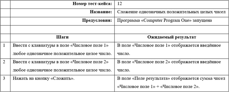 Для тестирования программы необходимо подготовить список проверок и написать тест-кейсы. Одной из проверок будет сложение однозначных положительных целых чисел. Специалисту по тестированию надо на эту проверку написать тест-кейс. Предположим, что это будет двенадцатый тест-кейс, который он начал писать на данную программу: